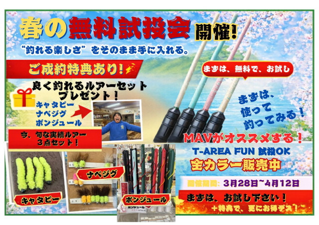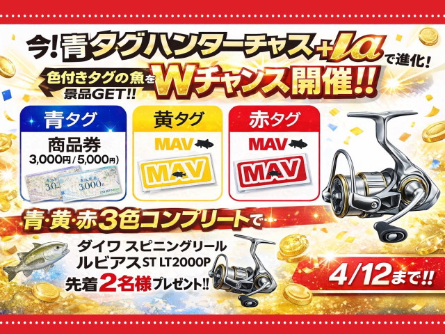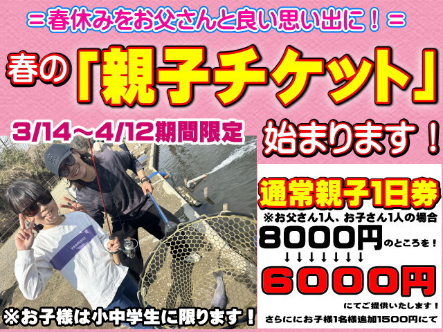![]() 期間中に3色集めればOK! 期間中に誰が一番最初にコンプリート出来るのか! タグは各色釣れた毎にゲストハウスに申請!(一度に3色持ってくるのはダメ!) ※青タグハンターにエントリーしている方が対象になります! ![]() ![]() 週末から暖かくなるとの事でいよいよ!スタートです! ナイター始まるとチケットも充実!色々なチケットでお楽しみください!
