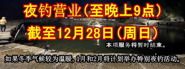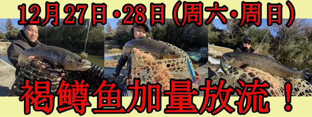![]() 年末年初大量放流活动!12月27日-1月4日 年末年初特别企划! 顶级鳟鱼(顶鳟)平日也持续放流1月3日特别加大规格放流! 伊藤鱼(日本哲罗鲑)今年下池同样放流怪物级个体! 褐鳟鱼下池连续每日放流! 岩鳟(Rock Trout)年末年初期间,即使严寒天气也持续放流! ![]() 年末年初不休息营业! 12月到新年期间强化放流不断! ![]() ![]()