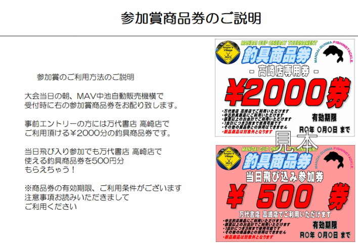 当日飛び入り参加でも高崎、伊勢崎店の釣具商品券を各店500円分がもらえちゃう!