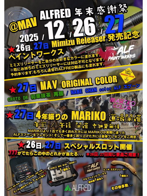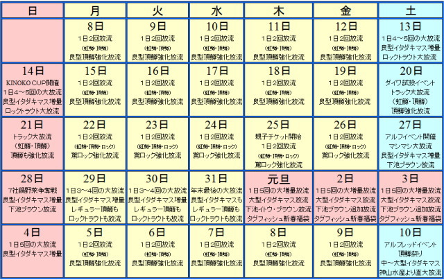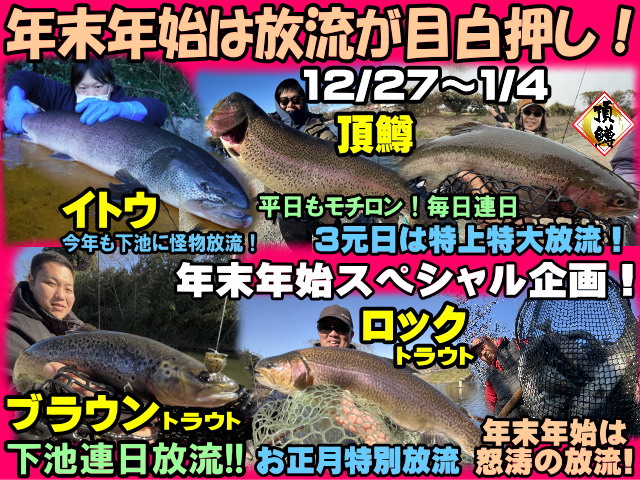 ![]() 年末年初大量放流活动!12月27日-1月4日 年末年初特别企划! 顶级鳟鱼(顶鳟)平日也持续放流1月3日特别加大规格放流! 伊藤鱼(日本哲罗鲑)今年下池同样放流怪物级个体! 褐鳟鱼下池连续每日放流! 岩鳟(Rock Trout)年末年初期间,即使严寒天气也持续放流! ![]() 年末年初不休息营业! 12月到新年期间强化放流不断! ![]() ![]()