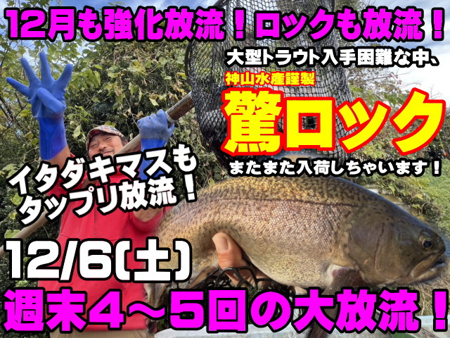 we’ve secured more of the premium Kami-yama Farm “Surprise Rock Trout”! Plenty of Itadaki Trout stocked as well! Saturday, Dec. 6 4–5 major stockings on the weekend!