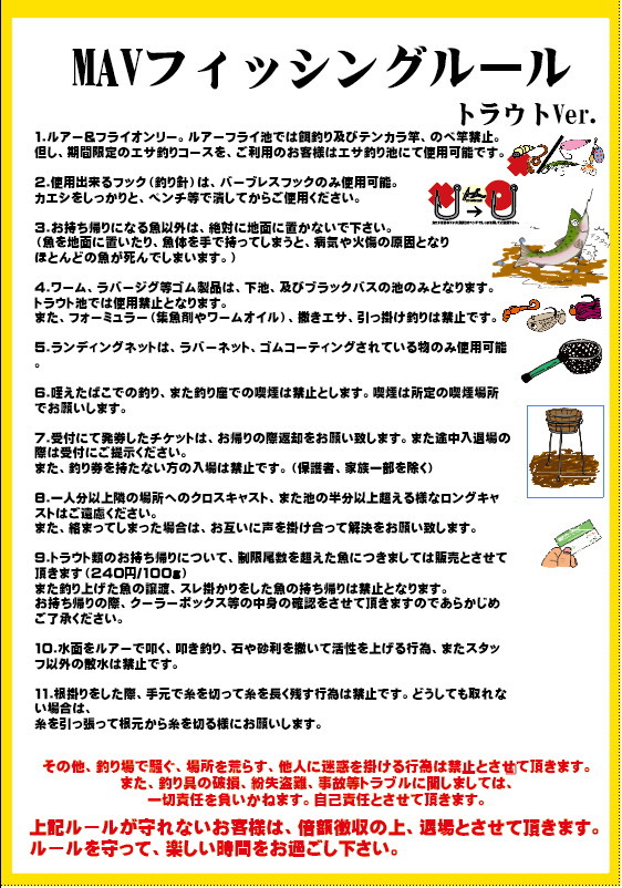 他人を釣ってしまう様な事故、怪我、盗難等のトラブルが発生した場合、当エリアでの責任を負いかねます。釣りをする際には十分気をつけて釣りをお楽しみください。 (場合によっては退場、罰金等の賠償責任を取らせていただきます) |