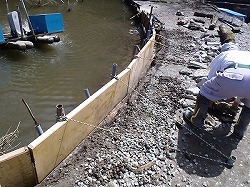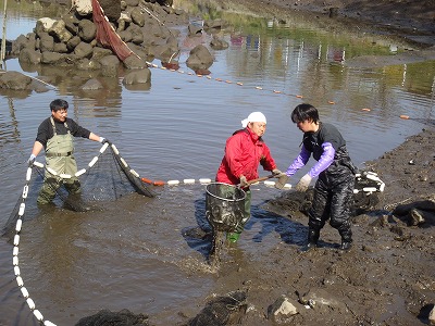 | まず一発目の作業は魚獲り!水が引けているので一網打尽に追い込みます! |