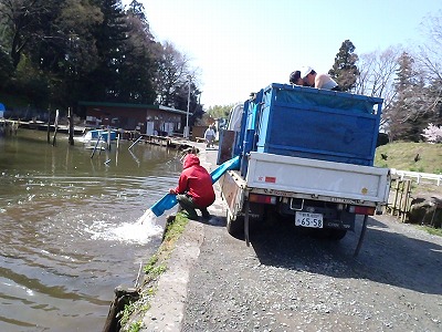 | 獲ったトラウト達を下池に放流〜!!下池は複合魚種えりあとしてリニューアルです。 |