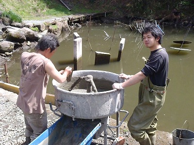 | 松ちゃんとチョロ君は今日は左官屋さん!セメントをミキサーでコネコネして一輪車に移していきます。今日1日で何体のセメントの袋をコネたのかな。相当な量使いました! |