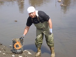 | ポンプに吸い寄せられたごみも一瞬でこんなになっちゃいます。ユンボで底の泥を掻くので泥の中に埋まっていた落ち葉やワームなどが大半です。 |