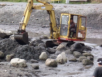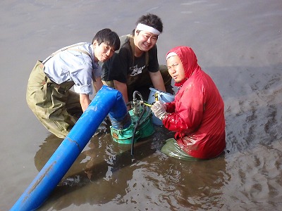 何十キロもあるポンプなので動かすのも3人がかり。助っ人の方々が居なかったら・・・本当に心強いっす。 |